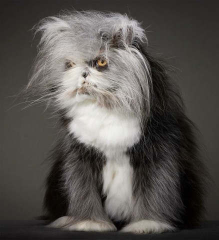 (Atchoum、オス10歳)です。ホルモン障害による多毛症で普通の猫より毛が多く、印象的な毛並みと鋭い目で人気を集める優しい性格の可愛い猫です。