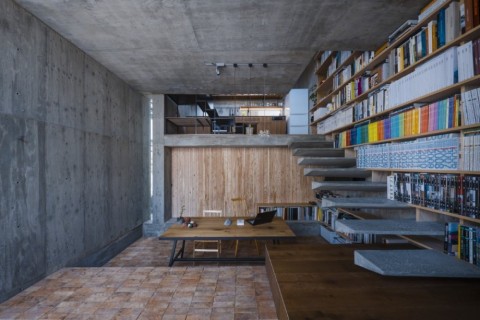 )さんと五十嵐友子さんが設計した東京の住宅「家の躯体」です。生活と仕事の境界が曖昧な夫婦のために計画した自邸。都心の小敷地の中で、大らかで“何処でも仕事ができる”住居を求め、7枚の床がズレながら重なり多様な役割を担う立体的な一室空間の建築を考案しています。