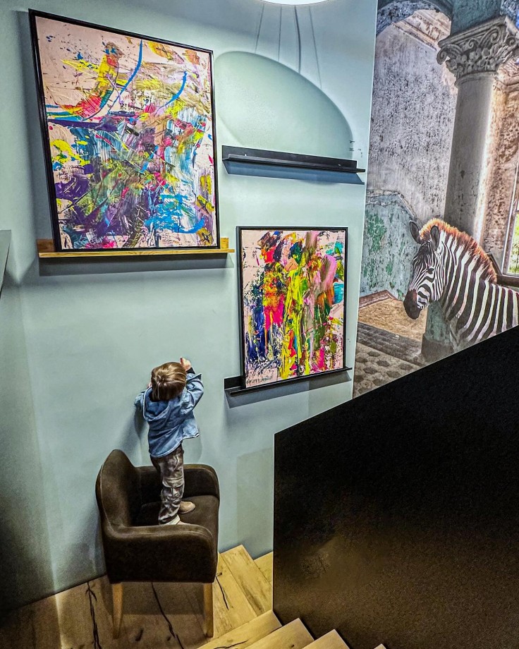 君が描く絵画です。2023年9月、イタリアの南チロルにある家族向けホテルへ旅行をした際、部屋にあった絵に釘付けになり、絵を描くように。動物を好んで描き、明るくカラフルな色使いの絵が高く評価されています。