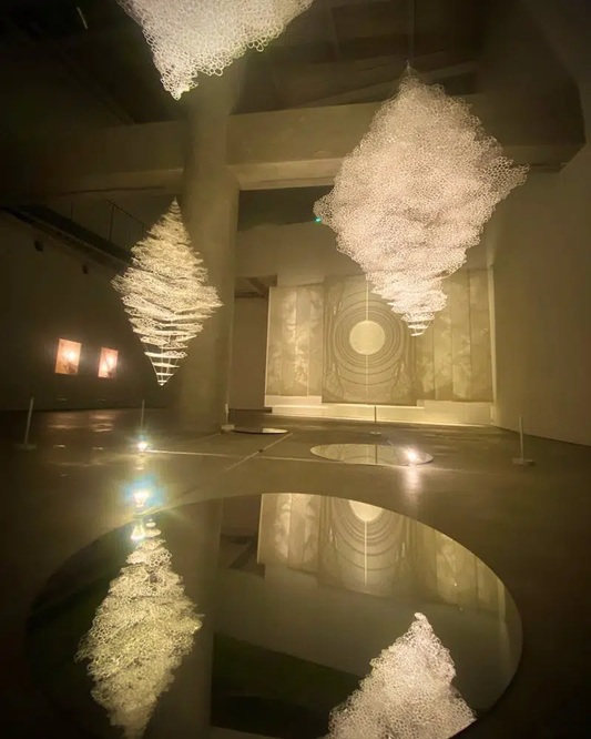 白い紙を複雑に切り抜いて天井から吊るした彫刻 / Ayumi Shibata