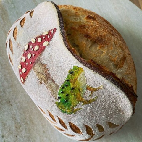 さんが作る、絵柄や模様を描いた美しいサワードウ・パンです。サワードウ・パンは、小麦粉と水、そして天然酵母の「サワードウ」を主原料として作られるパンの一種。ウサギや魚、カボチャ、キノコなど、さまざまな絵柄や模様が描かれた、クリエイティブで楽しいパンを作っています。
