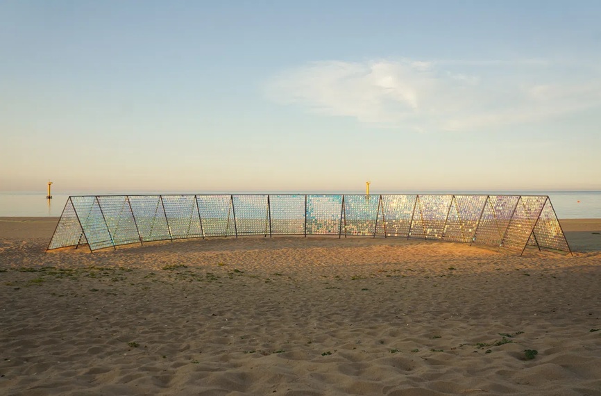 さんが制作し展示した 光のインスタレーション「Art Dome Pavilion」です。吊り下げられた8000個の虹色に輝くアクリルピクセルが、風に揺らめき、日光の周期に応じて変化し、浜辺の自然を反映します。
