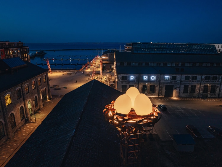 エストニア・タリン市の港に展示された、鳥の巣をモチーフにしたインスタレーションです。かつての造船所に残る古い照明塔をどうするかアイデアを募ったとき、デザイン会社