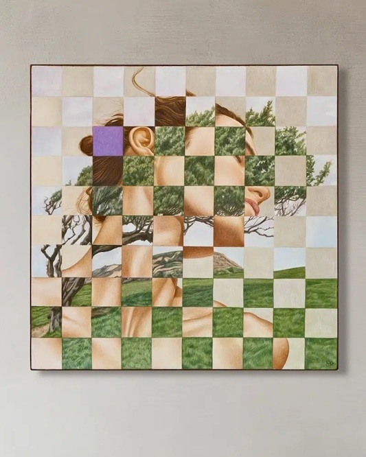 さんが、チェスに着想を得て描いた色鉛筆画です。木製パネルの市松模様のマス目に2つのイメージを描くことで、対比や秩序、神秘性をもたらし、作品全体にリズムと対話を生み出しています。