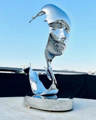 さんが制作し、米オレゴン州ポートランドの新しいアパートの一角に展示した彫刻作品「Splash(スプラッシュ)」です。高さ6メートルの巨大な水しぶきに浮かび上がる人の顔を、ステンレス鋼で液体のように表現しています。