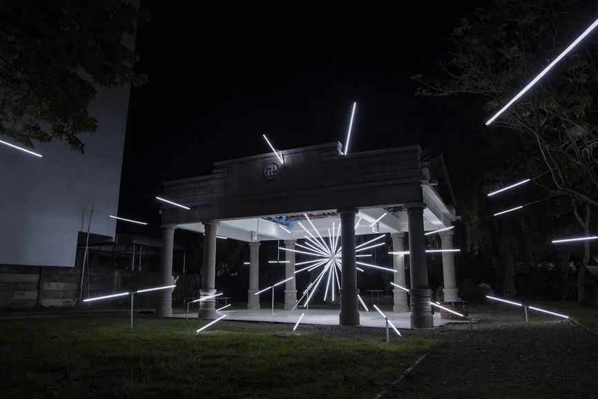 さんが手がける光のインスタレーションです。最新の作品では、台湾の台南市塩水区にある100年の歴史を持つ旧仏教寺院を、建物を貫くように放射状に輝く光線で表現しています。