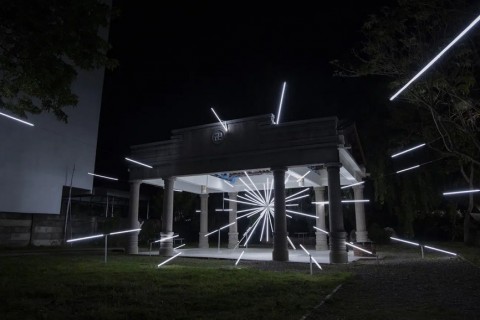 建物を貫いて放射状に輝く光のインスタレーション / Jun Ong