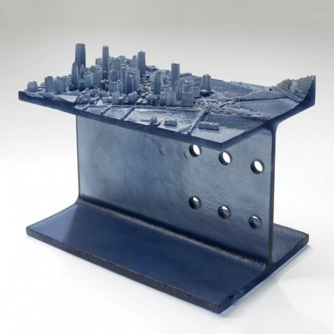 さんが、アメリカの各都市をその産業の歴史と合わせて表現したガラスの彫刻です。彫刻を通じて産業の成長と都市の発展を探究し、鋳造ガラスにより、鉄骨や車のエンジンなど、その都市の産業を代表するオブジェクトの上に都市景観を表現しています。