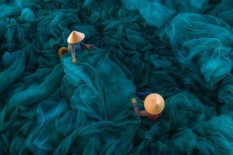 さんが、ドローンを使用してベトナムの風景を撮影した写真シリーズです。山の斜面に広がる棚田や、川でスイレンの花を収穫する女性たちなど、ベトナムの美しい里山の風景や人々の伝統的な営みを、上空からの視点で撮影しています。
