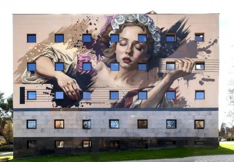 さんが、楽器を演奏する人物を建物に描いた壁画シリーズです。建物の形、外壁の模様、窓の配置など建築要素を巧みに生かして、ギターやヴァイオリン、ハープなど楽器を奏でる人物を描いています。