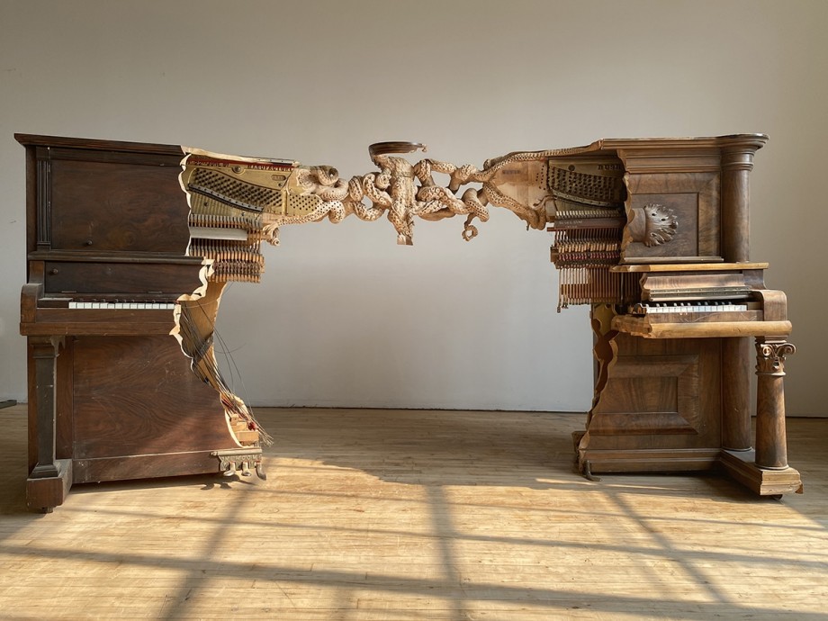 さんが、2台のピアノをタコの触手で1つに結び付けた彫刻作品です。2台のピアノから伸びる彫刻されたタコの触手が絡み合って1つに結合する、シュールな作品に仕上げています。