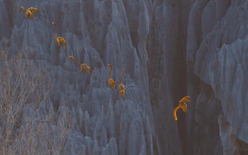 カリフォルニア科学アカデミーが主催し、12回目を迎える自然写真コンテスト「BigPicture Photography Competition」の2025年受賞者の作品です。最優秀賞に輝いた Kat Zhou氏の作品「Leap of Faith(マダガスカルの深い渓谷を跳び越える子連れのキツネザル)」をはじめ、風景、植物、野生動物の美しい瞬間を捉えた自然写真の数々が選ばれています。