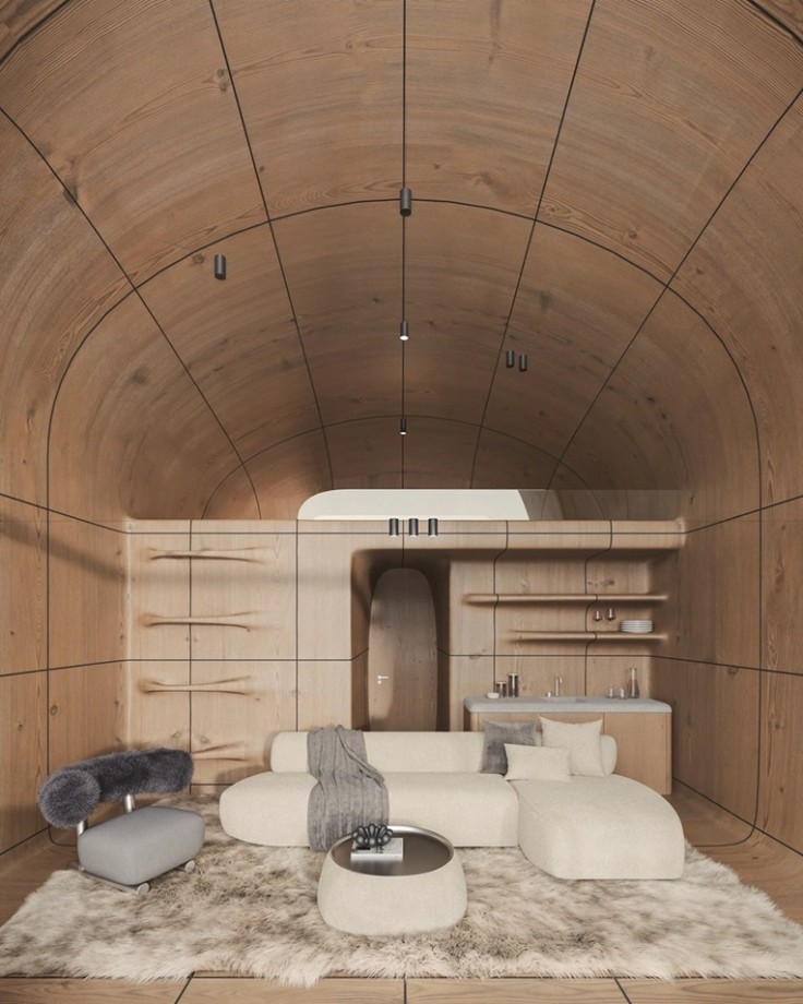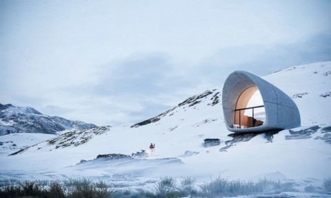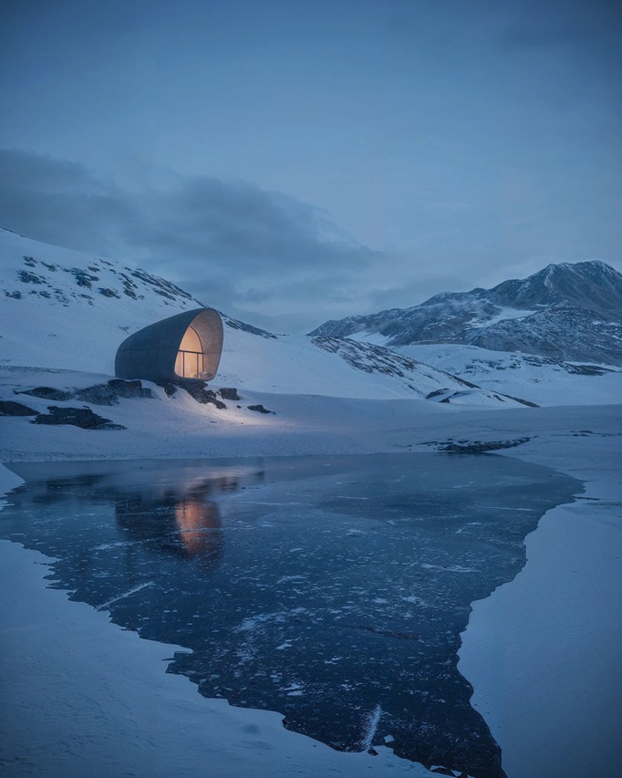 が設計。美しい山々の風景に溶け込むミニマルなコンクリートの曲面で覆われたデザインで、床から天井まで届く巨大な窓から雄大な景色を一望できます。