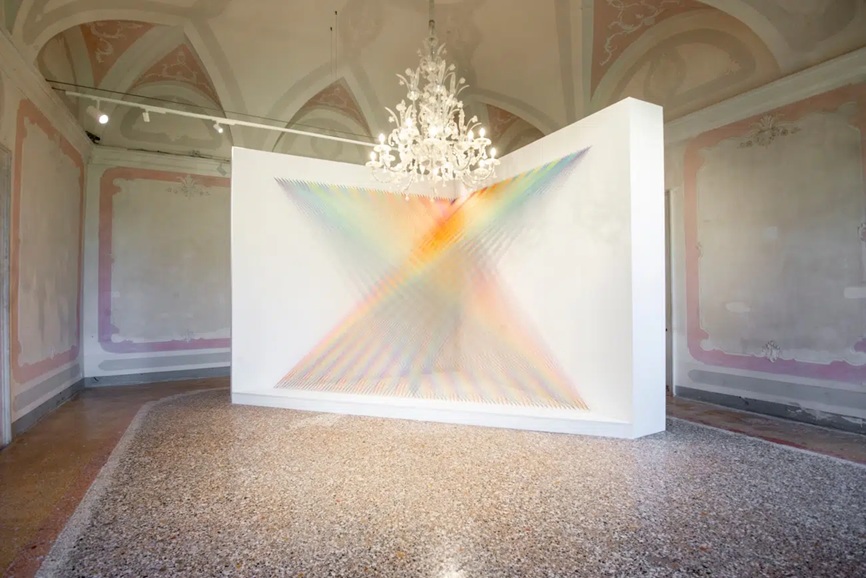 Dazzling Thread Art Installation Stretches String To Create Luminous Indoor Rainbows