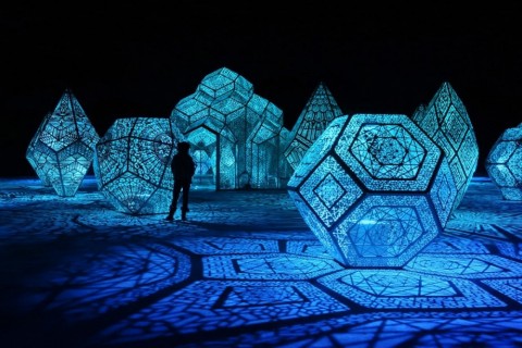 が、カリフォルニア州パソ・ロブレスの野外展示場に展示した、光る多面体彫刻のインスタレーション作品です。44の複雑な透かし模様の多面体からあふれる光が地面に美しい影を描く、幻想的な没入型インスタレーションです。