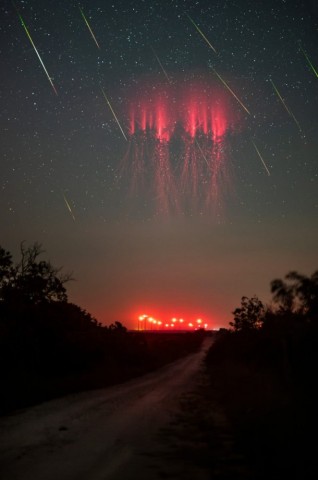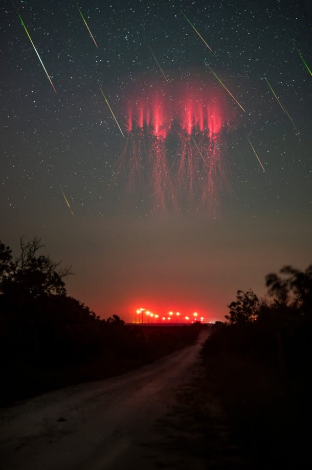 さんが、ペルセウス座流星群の中に出現した巨大なレッドスプライトを撮影した写真です。レッドスプライトは、雷雲の上空で発生する放電現象の一種。8月12日、米オクラホマ州西部で、流星群が流れ落ちる中、鮮やかな赤い光が発光する瞬間を捉えています。