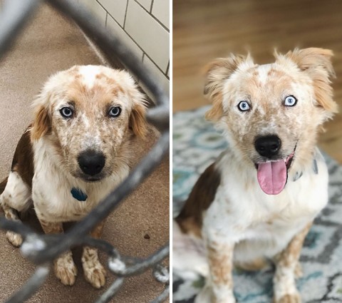 シェルターにいた時の沈んだ表情から、家に来た時の青い目を輝かせた笑顔へと見違えるほど変化し、家族に迎え入れられて幸せそうな表情を浮かべています。