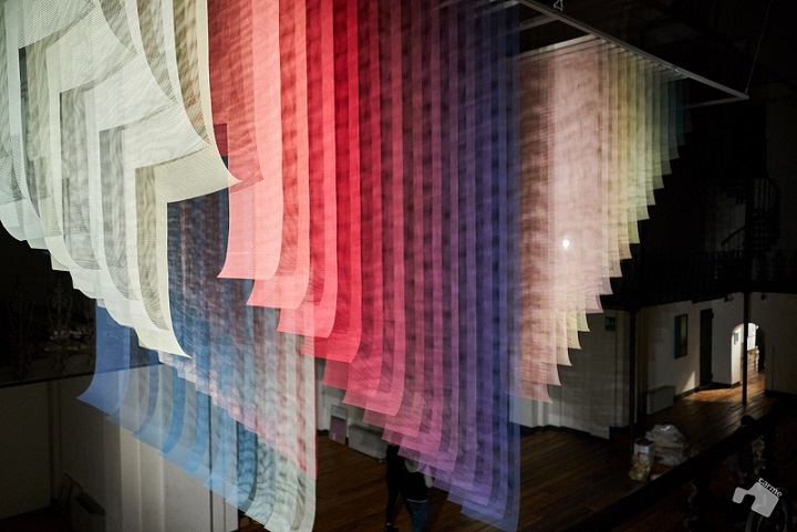 が、イタリア・ブレシアにある元教会に展示したインスタレーション作品です。教会の身廊にグラデ―ションの美しい半透明の布が連なり、幻想的な雰囲気を醸し出しています。