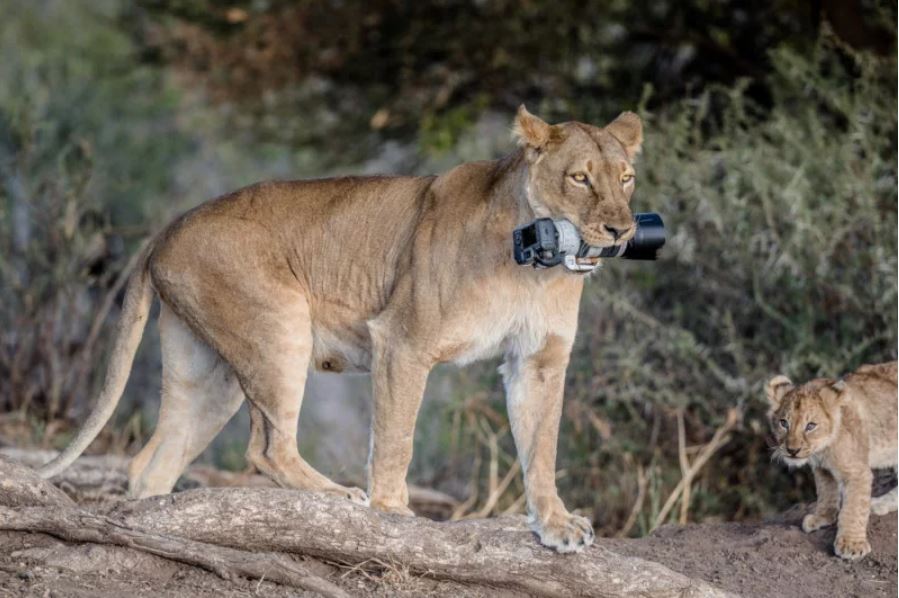 さんが2018年7月にアフリカ・ボツワナでライオンを撮影していた際に、物音に気づいて接近してきたライオンの母親にカメラを奪われてしまった時を撮影したものです。