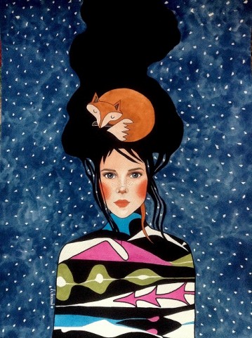 さんが水彩で描いた女性の肖像画です。鮮やかな色彩と長い髪の存在感放つ女性の肖像が描かれています。