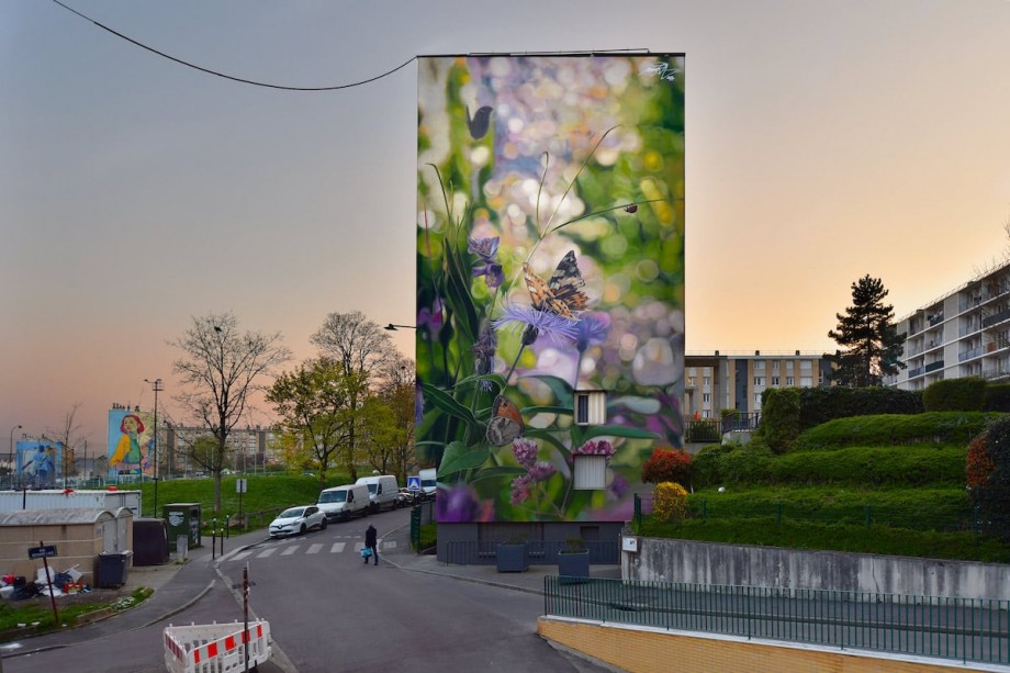 さんが、ヴェルサイユのジュシュー地区の建物に描いた、花に止まる蝶の壁画です。彼の母親の庭で撮った写真をもとに、蝶や虫たちが花や草に止まる美しい情景を、大きな壁いっぱいに写実的な描写で描いています。