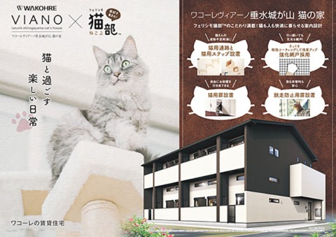 が共同開発した、猫と暮らすための賃貸物件「ワコーレヴィアーノ高丸 猫の家」です。キャットウォークや猫用出入口、傷のつきにくい床材など、猫も飼い主も快適に暮らせることにこだわってイチから設計された集合住宅です。