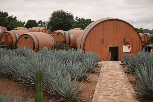 メキシコ・テキーラの町近くにある巨大な樽の形をしたユニークなホテル Matices Hotel de Barricas です。テキーラ蒸留所の敷地内、テキーラの原料となるリュウゼツランの畑に、30の樽型の部屋が点在します。