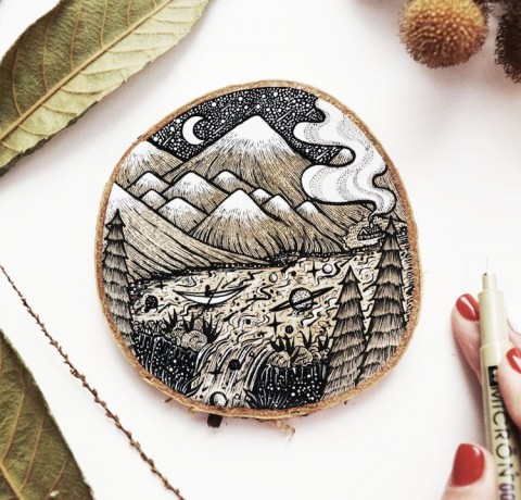 丸木をスライスした木片に描く幻想的な自然風景 / Melpomeni Chatzipanagiotou