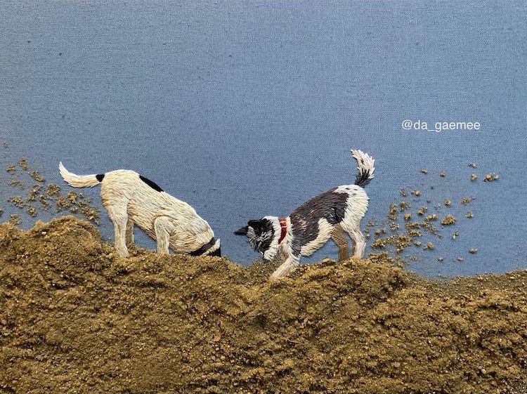無邪気に遊ぶ犬たちを描いた刺繍アート / @da_gaemee