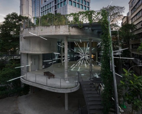 さんが、LED照明を使い、スターバースト(星形、光線が中心から放射状に広がった形)を表現したインスタレーション作品です。クアラルンプールの古い倉庫に111本の細長いLED照明を配置し、放射状に広がる光の軌跡を表しています。