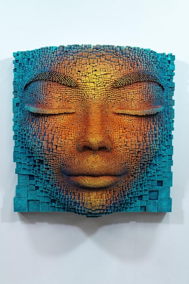 Enigmatic Faces Emerge From Vibrantly Colored Wooden “Pixels”