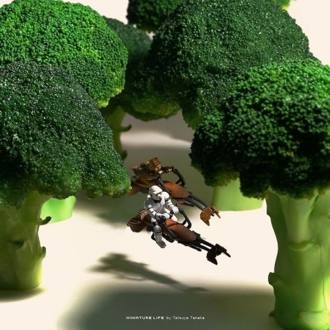 )さんが、ミニチュアの人形と日用品を使って映画スターウォーズのシーンに見立てたジオラマ写真です。家を卵の殻に、ランドセルを宇宙船に、ブロッコリーを森に見立てたりした遊び心あふれる作品です。