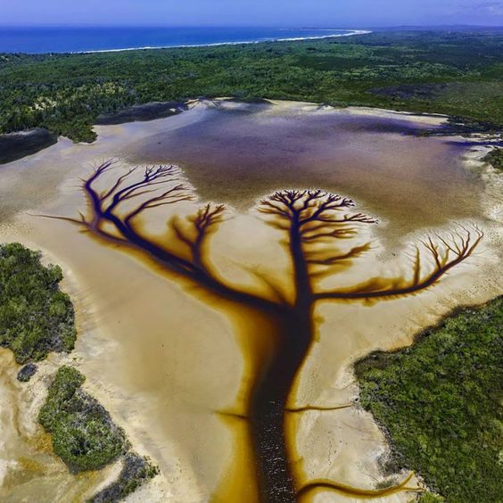 オーストラリア東部のカコラ湖で、同国の写真家 Derry Moroney さんがドローンにより撮影した不思議な水流の跡です。海岸低地にあるカコラ湖の湖底を水流が侵食して巨大な木のようなパターンを作り出しています。