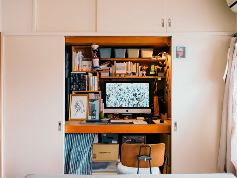 )さんが、自宅の押し入れをDIYして活用しているデスクです。押し入れを開けると、パソコンや棚が整然と並ぶ作業スペースが現れる秘密基地感あふれるデスクです。