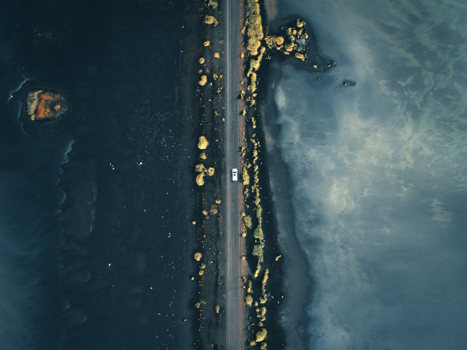 さんが、旅行中に遭遇した道路や小道を上空から撮影した空中写真です。人里離れた雄大な自然の中を一本の道が通る風景を、1台の白い車を中心にドローンで上空から撮影しています。
