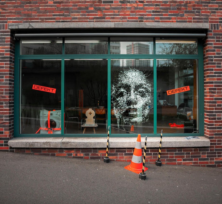 さんが、ガラス板をハンマーで叩いて描く人物の肖像画です。ハンマーで叩いてガラスの表面に白い粉砕跡や亀裂をつくり、印象的な人物がを描いています。