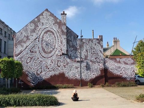 さんが、フランス・カレーの博物館としてオープンする19世紀の工場にスプレーで描いたレースの壁画です。レース作りの伝統がある町にオープンするレース博物館の外壁に、複雑なレースの絵柄をスプレーで描いています。