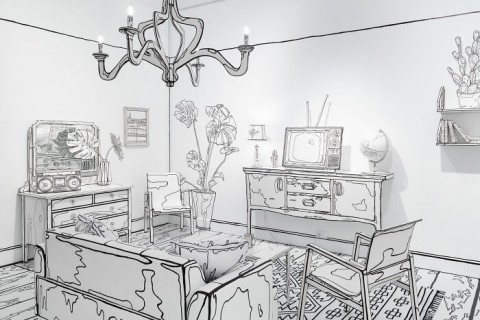さんが手がける、2次元の世界のような白黒の部屋です。壁や床、家具や小物を、白地に黒いペンで描いたデザインとし、白黒のイラストのような部屋を作り上げています。