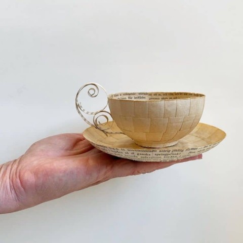 さんが、古い本の紙片でつくるティーカップなどのペーパーアートです。古い本の紙片をバランス良く緻密に張り重ねて、ティーカップやスプーン、茶わん、ポット、シューズなどの素朴な紙の彫刻を作っています。