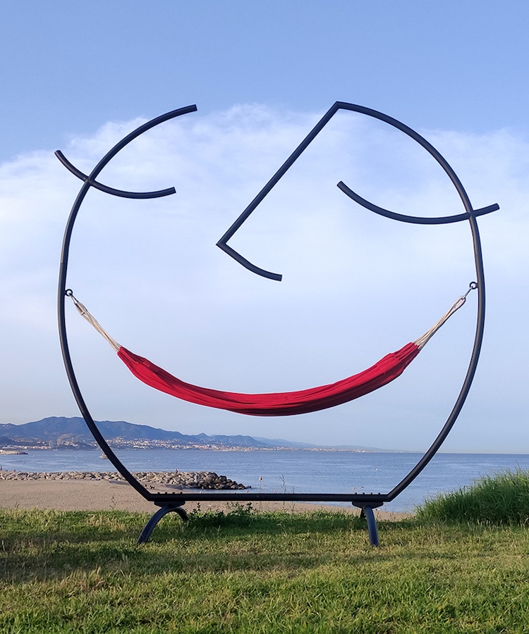 さんが手がけた、笑顔をモチーフにしたハンモック「The Happy Hammock」です。黒い金属フレームで顔の輪郭や目、鼻を描き、吊り下がったハンモックの布地を口に見立てて、笑顔を表現しています。