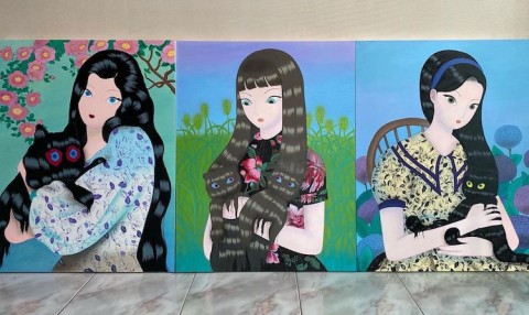 さんが、髪に黒猫の幻影が宿る女性を描いた作品シリーズ Mirage Cat です。艶やかな長い髪に浮かび上がる黒猫を女性が抱いているように描いた独特な肖像画です。