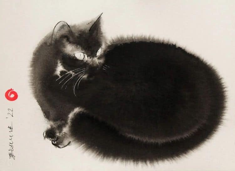 黒インクで水墨画のように描く猫の絵 / Endre Penovac