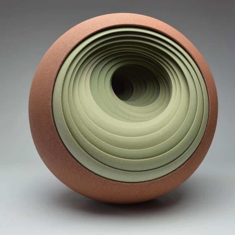 さんが手がける入れ子状の球体の陶芸作品です。薄いシェル状の球形の層を入れ子構造で重ね合わせて、同心円状に広がる美しい球体の彫刻を作っています。