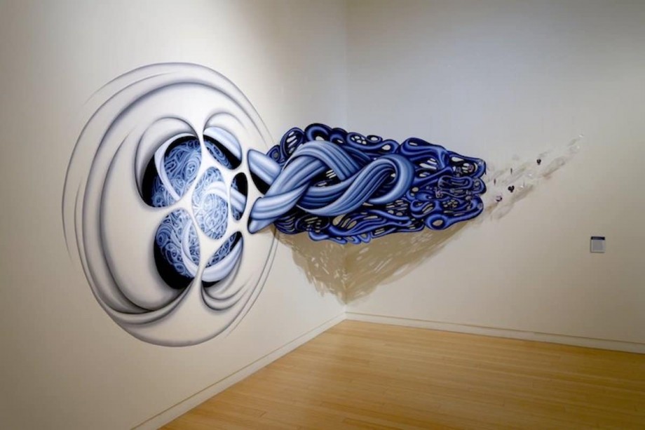 さんが、Mesa Contemporary Arts Museum に描いた立体的に見える壁画です。異次元への入り口に幾つもの渦が流れ込んでいるような幻想的な絵を、錯視効果を利用して壁から浮き上がっているかのように立体的に描いています。