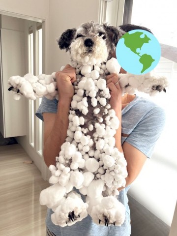 (4歳メス)です。大雪の日、庭の積もった雪の中に飛び込んではしゃいで遊んだ結果、体じゅうに雪玉が付いた可愛い犬です。