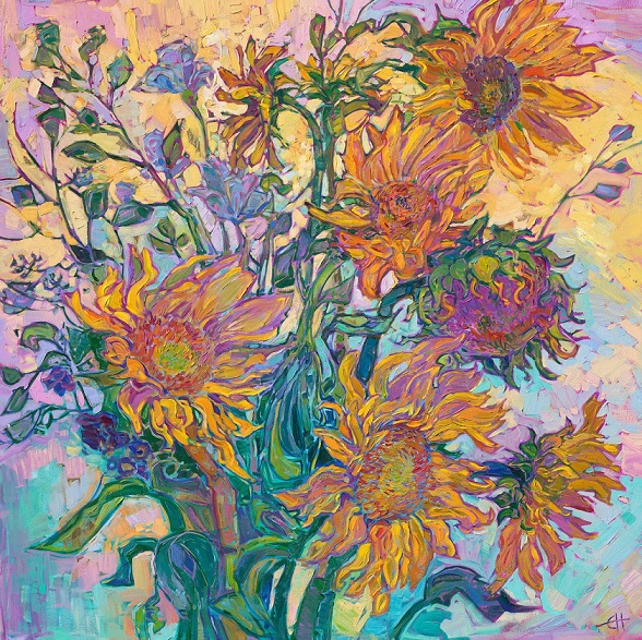 米画家が描く花瓶に挿したひまわりの絵画 / Erin Hanson