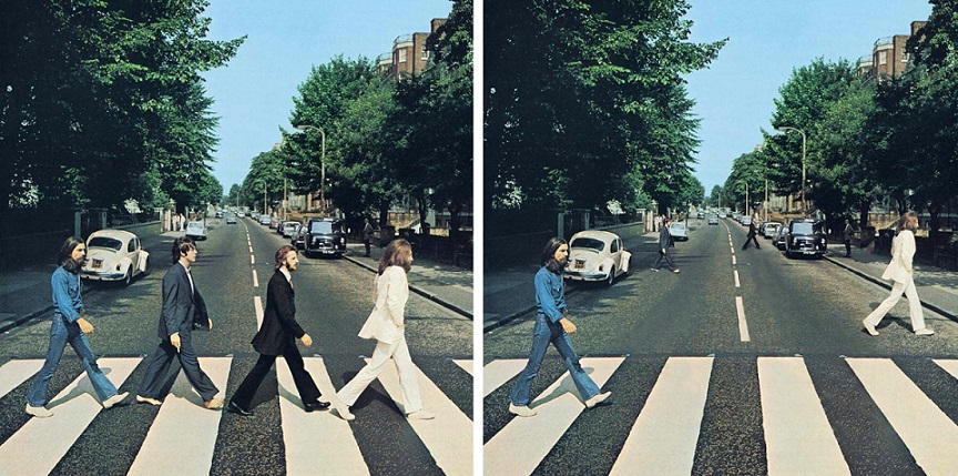 が、新型コロナウイルスの影響が及ぶ現在の社会状況を反映して、有名な洋楽アルバムのカバー写真に映るアーティストたちの立ち位置を編集したものです。集まって映っていたアーティストたちの写真を、距離をとってポーズをとる構図に変えたカバー写真です。