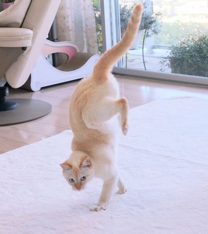 猫じゃらしを追いかけてするダイナミックな動きが、まるで踊っているダンサーのような可愛い猫です。