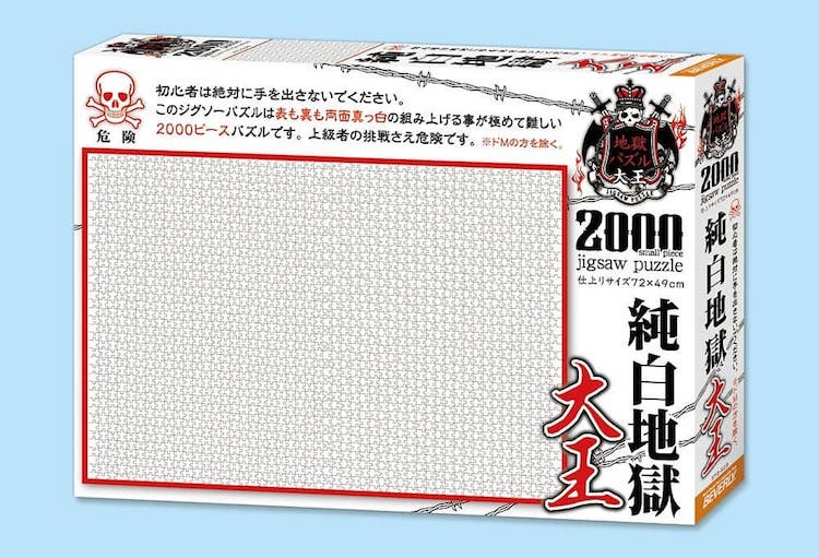が販売する模様が全くない無地の白いジグソーパズルです。初心者は絶対に手を出さないでと警告する、表も裏も両面真っ白の組み上げることが極めて難しい2000ピースのパズルです。