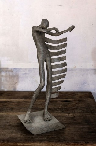 さんが制作する人物のブロンズ彫刻です。胴体をらせん状にねじらせたり、くねくねと折り曲げたりした独特の表現により、人体の流動性を表した美しい人物の像をつくっています。